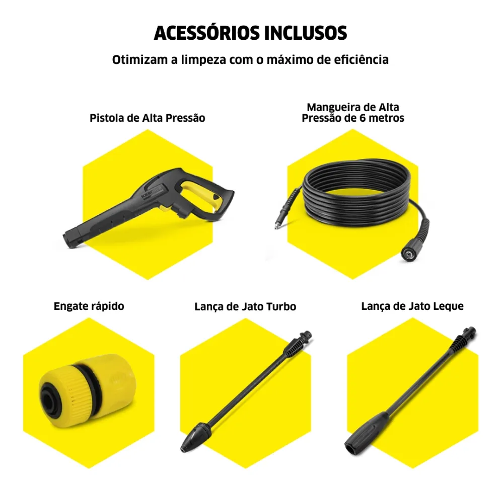 Atenção! esse modelo não vem com snowfoam nem lança de jato reto, apenas lança jato leque e lança jato turbo giratório, sem quiser mais acessórios, tem que comprar como eu fiz! mas vale muito a pena , estou satisfeito, recomendo.